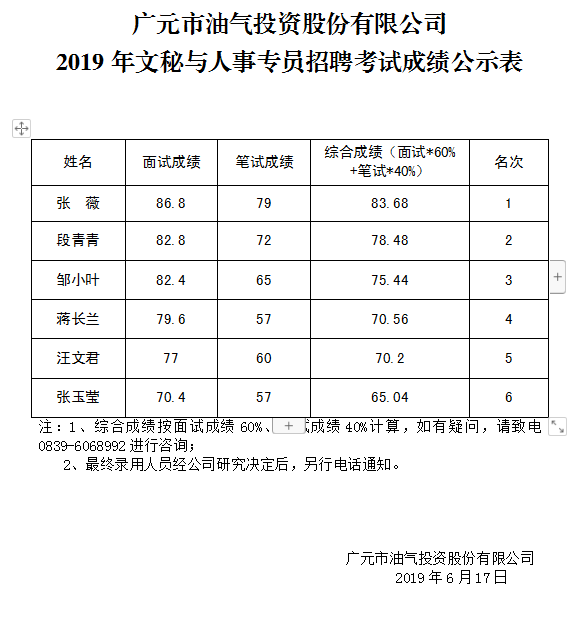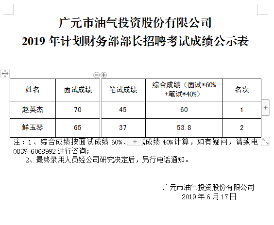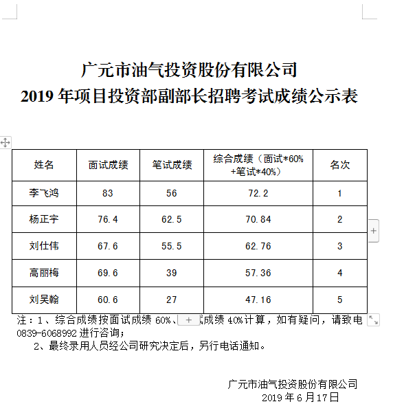 廣元市油氣投資股份有限公司2019年公開招聘考試成績公示表