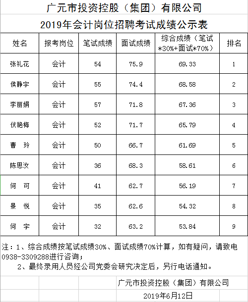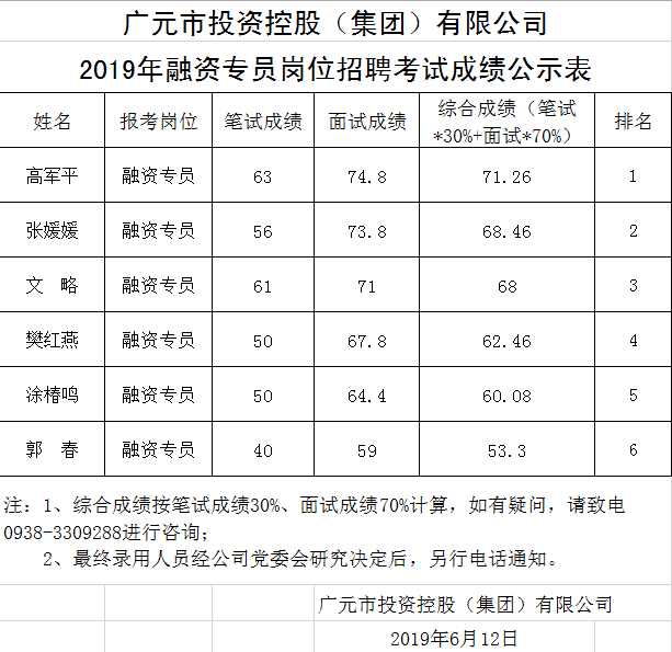 廣元市投資控股(集團(tuán))有限公司關(guān)于公開招聘工作人員成績(jī)公示表
