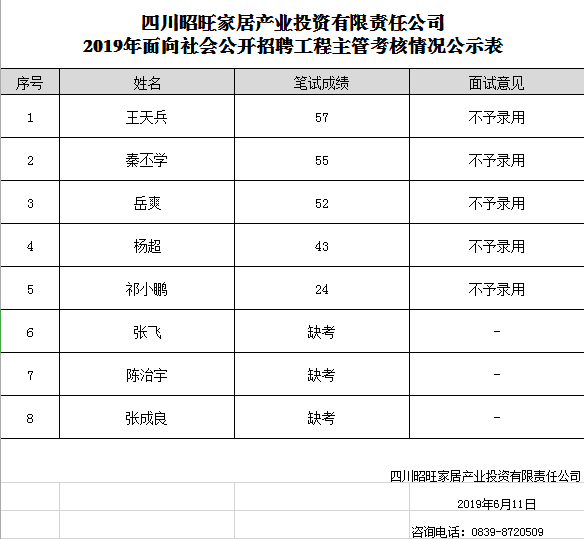 四川昭旺家居產(chǎn)業(yè)投資有限責(zé)任公司2019年面向社會公開招聘工程主管考核情況公示表